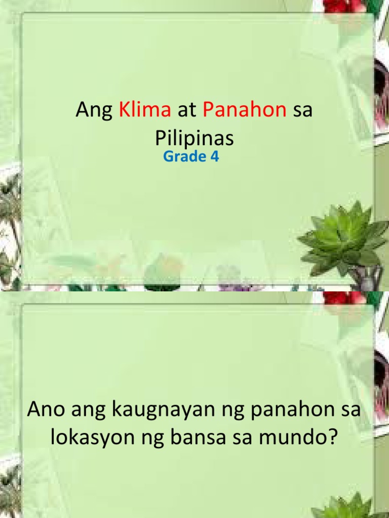 Tawag sa Pangkalahatang kalagayan ng atmospera sa mahabang panahon. Matapos matalakay ang aralin ng guro sa araw na ito ang mga mag-aaral ay inaasahang. Matatagpuan ang Pilipinas sa mababang latitude sa itaas ng equator sa sonang tropikal.