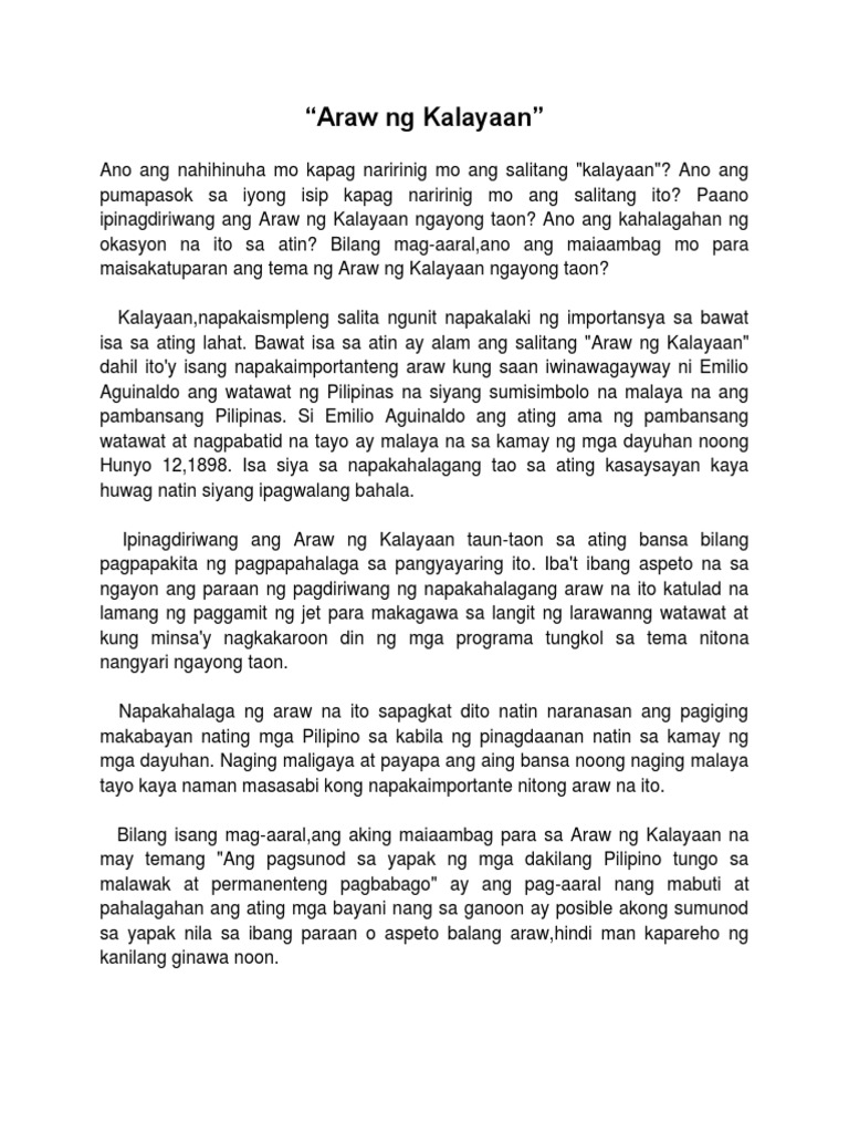 Mula sa ating mga bayani na nagsigasig na makamtan ang kalayaan ng ating bansa kami sa Kagawaran ay sumasaludo sa ilang salinlahing Pilipino na nagtaguyod ng ating mayaman na kasaysayan. Ito rin ang unang araw ng kalayaan sa ilalim ng aking administrasyon. And we have seen nothing but positive Tagalog Essay Tungkol Sa Araw Ng Kalayaan results.