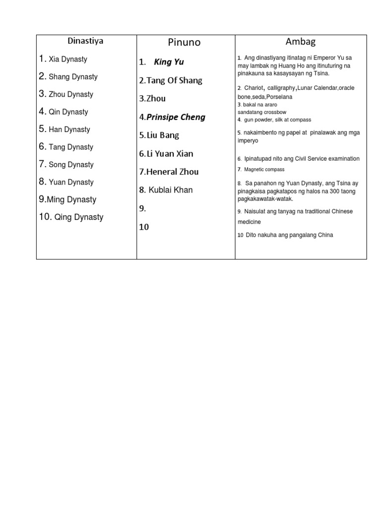 Naimbento ang kaisipang mandate of Heaven. Dinastiya-ay tumutukoy sa pamamahala sa isang lugar kung saan ang mga pinuno nito ay nagmula sa iisang pamilya. AralingPanlipunan DinastiyaSaChina ChinaAng Kabihasnang Tsina ay umusbong sa lambak sa pagitan ng Ilog Huang Ho at Ilog YangtzeBawat dinastiya ay may nat.